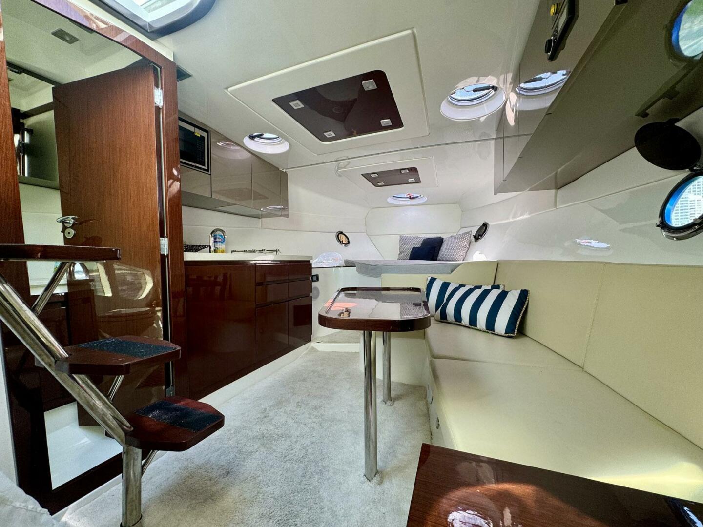 Below deck, the indulgence continues with a well-appointed interior that exudes elegance at every turn. Rich woods, fine fabrics, and premium finishes create an ambiance of refined luxury, while ample natural light floods the living spaces, creating an inviting atmosphere for relaxation and entertainment.