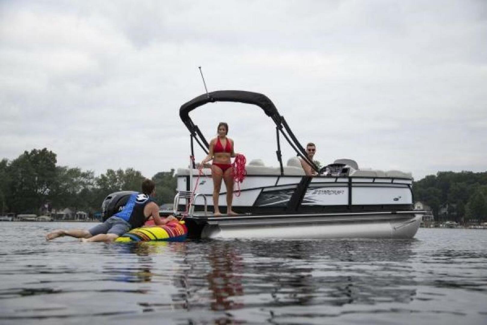 The Starcraft SLS 1 is a 21'8 pontoon boat with a maximum power rating of 200 HP. Included are many value-adding standard features such as a Bimini top, comfortable lounge seating, and an AM/FM stereo with Bluetooth connectivity.
